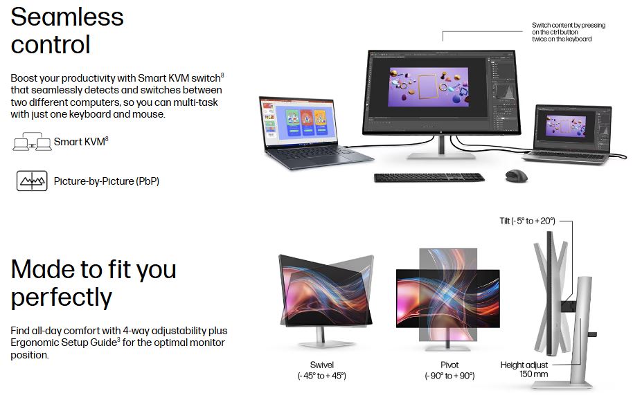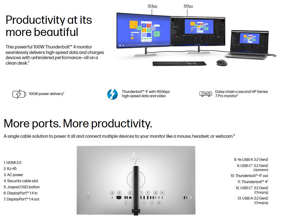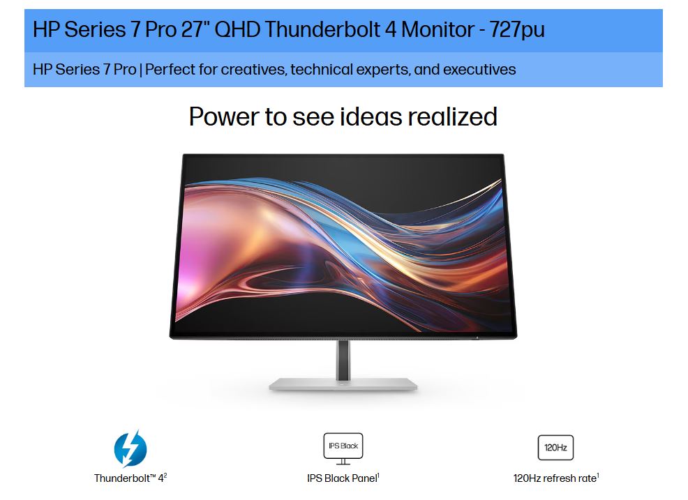 HP Series 7 Pro 727PU 27′ 2K QHD IPS Monitor 2560×1440 16:9 5ms Height Adjust Tilt Swivel Pivot Thunderbolt 4 HDMI DP USB-C VESA 3yrs