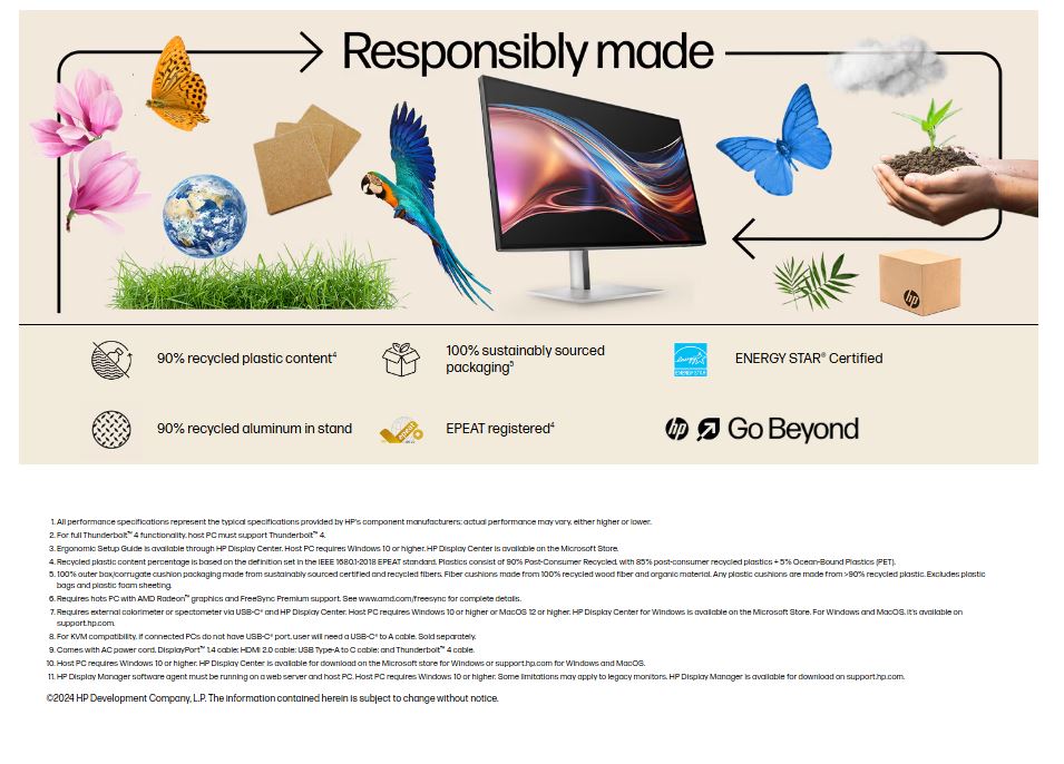 What’s in the box Monitor; Thunderbolt™ cable; DisplayPort™ cable; HDMI cable; Warranty card; Quick Setup Poster; 1 USB Type-C® to Type-A cable; AC power cord; Color calibration report; VESA mount adapter