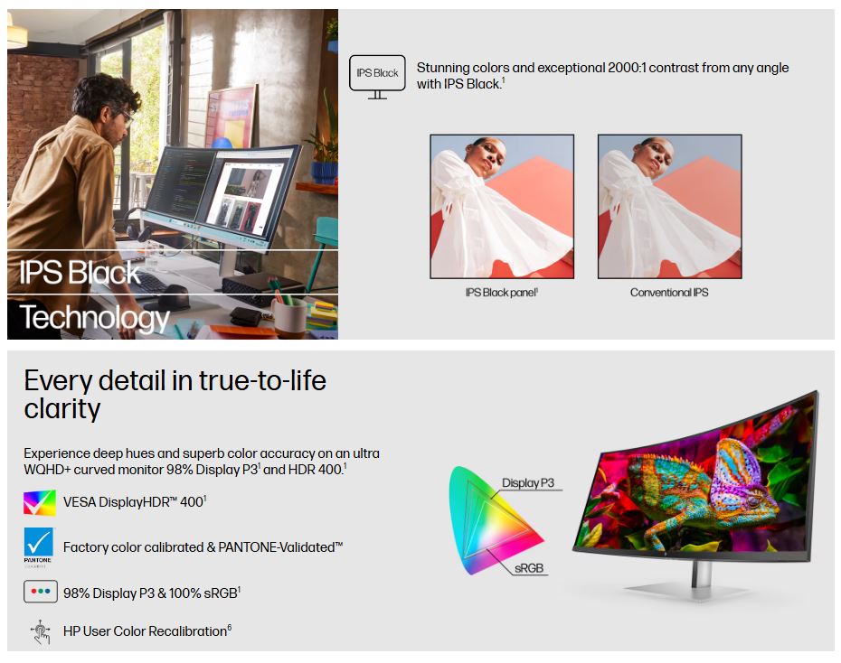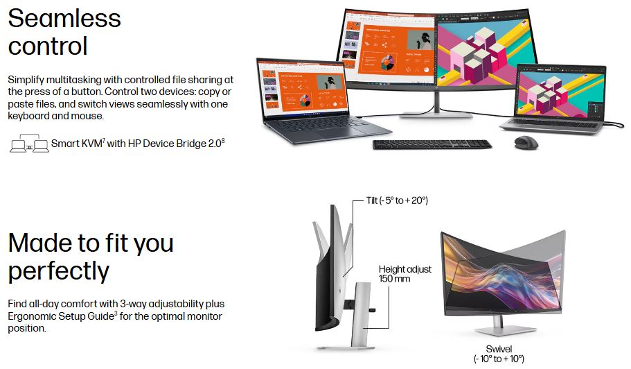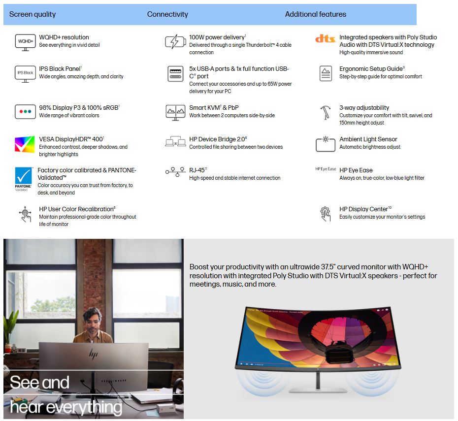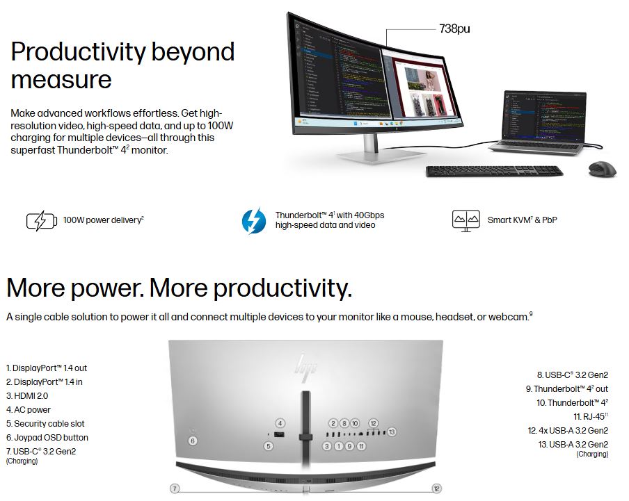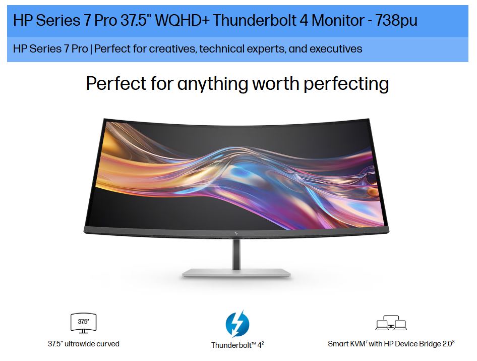 HP Series 7 Pro 738PU 38′ 4K WQHD curved IPS Monitor 3840×1600 21:9 5ms Height Adjust Tilt Swivel Pivot Thunderbolt 4 HDMI DP USB-C VESA 3yrs
