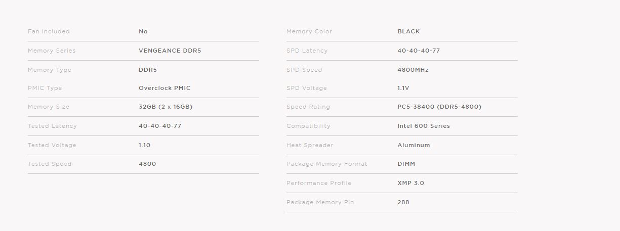 CORSAIR VENGEANCE DDR5, optimized for IntelĀ® motherboards, delivers the higher frequencies and greater capacities of DDR5 technology in a high-quality, compact module that suits your system. Tightly-screened high-frequency memory chips power your PC through faster processing, rendering, and buffering than ever, with onboard voltage regulation for easy, finely controlled overclocking. CORSAIR iCUE software enables real-time frequency monitoring, onboard voltage regulation, and Intel XMP 3.0 profile customization. A distinctive solid aluminum heatspreader keeps your memory cool, while ensuring wide compatibility with a huge range of motherboards and CPU coolers. With a limited lifetime warranty as your guarantee of reliability for years to come, VENGEANCE DDR5 continues a long-standing legacy of memory performance.