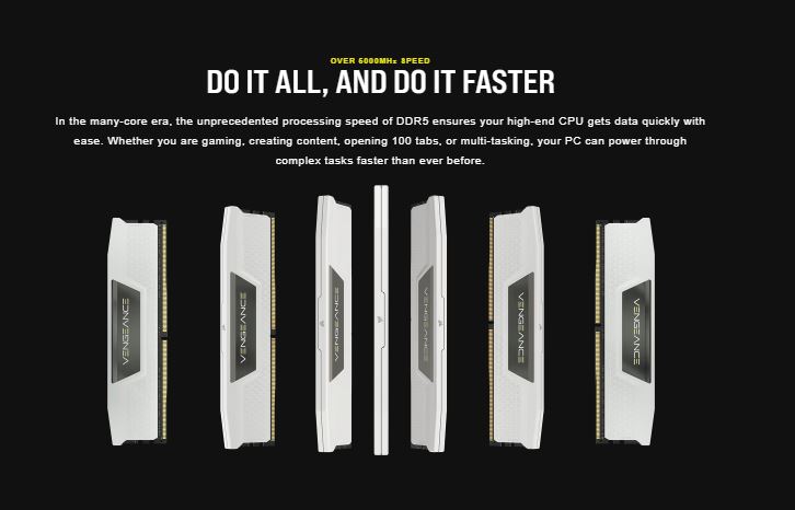CORSAIR VENGEANCE DDR5, optimized for Intel® motherboards, delivers the higher frequencies and greater capacities of DDR5 technology in a high-quality, compact module that suits your system. Tightly-screened high-frequency memory chips power your PC through faster processing, rendering, and buffering than ever, with onboard voltage regulation for easy, finely controlled overclocking. CORSAIR iCUE software enables real-time frequency monitoring, onboard voltage regulation, and Intel XMP 3.0 profile customization. A distinctive solid aluminum heatspreader keeps your memory cool, while ensuring wide compatibility with a huge range of motherboards and CPU coolers. With a limited lifetime warranty as your guarantee of reliability for years to come, VENGEANCE DDR5 continues a long-standing legacy of memory performance.