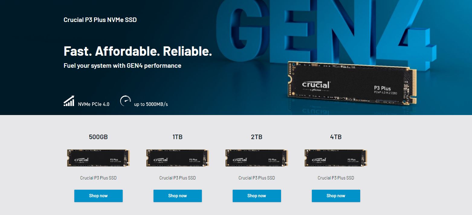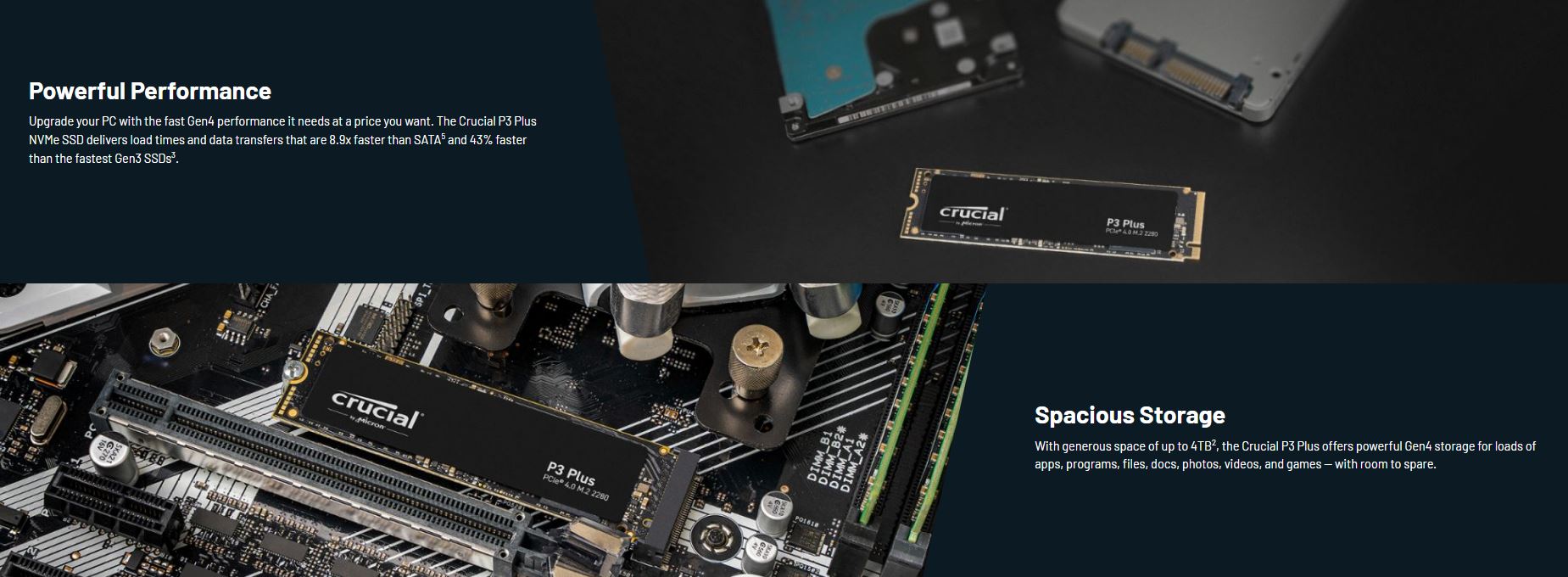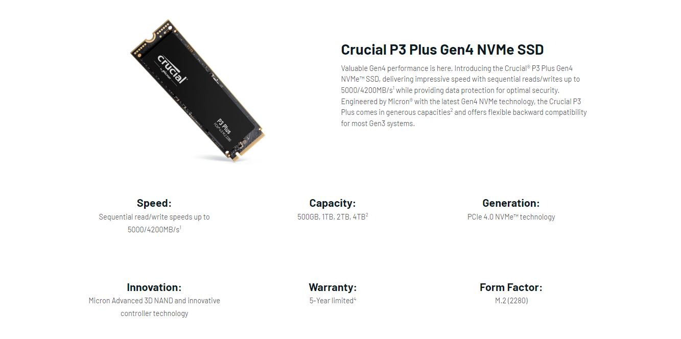 Valuable Gen4 performance is here. Introducing the Crucial® P3 Plus Gen4 NVMe™ SSD, delivering impressive speed with sequential reads/writes up to 5000/4200MB/s1 while providing data protection for optimal security. Engineered by Micron® with the latest Gen4 NVMe technology, the Crucial P3 Plus comes in generous capacities2 and offers flexible backward compatibility for most Gen3 systems.