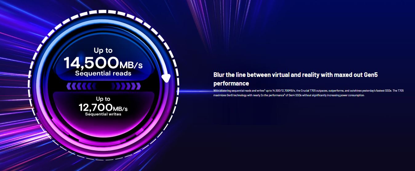 The Crucial T700 PCIe® 5.0 NVMe™ SSD offers speeds of up to 12,400MB/s sequential reads and up to 11,800MB/s sequential writes1 (up to 1,500K IOPS random reads/writes) for faster gaming, video editing, 3D rendering and heavy workload applications.