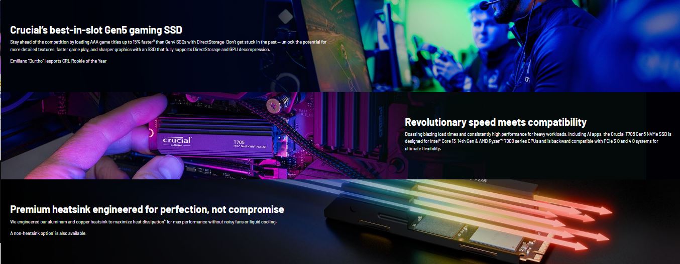 Crucial T705 2TB Gen5 NVMe SSD Heatsink – 14500/12700 MB/s R/W 1200TBW 1500K IOPs 1.5M hrs MTTF with DirectStorage for Intel 14th Gen & AMD Ryzen 7000