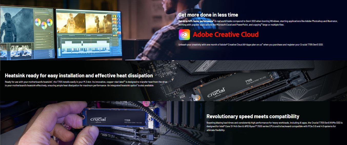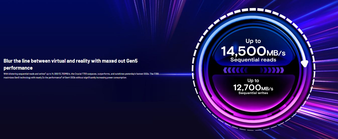 The Crucial T700 PCIe® 5.0 NVMe™ SSD offers speeds of up to 12,400MB/s sequential reads and up to 11,800MB/s sequential writes1 (up to 1,500K IOPS random reads/writes) for faster gaming, video editing, 3D rendering and heavy workload applications.