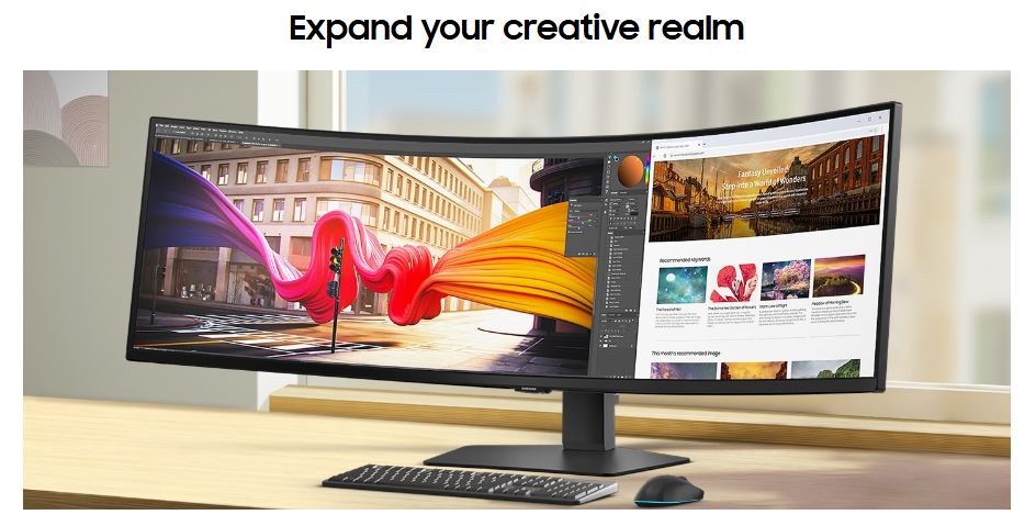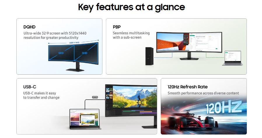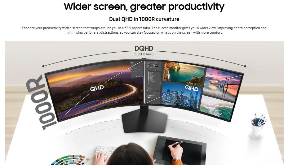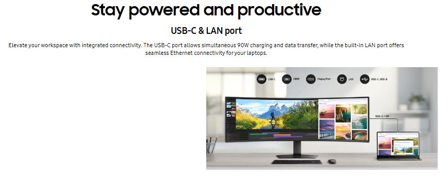 Samsung 49′ ViewFinity Monitor Dual QHD 5120×1440 5ms 32:9 1000R Tilt Swivel Height Adjust VESA DisplayHDR 400 1xUSB-C DP 2xHDMI LAN Prot HAS Speaker