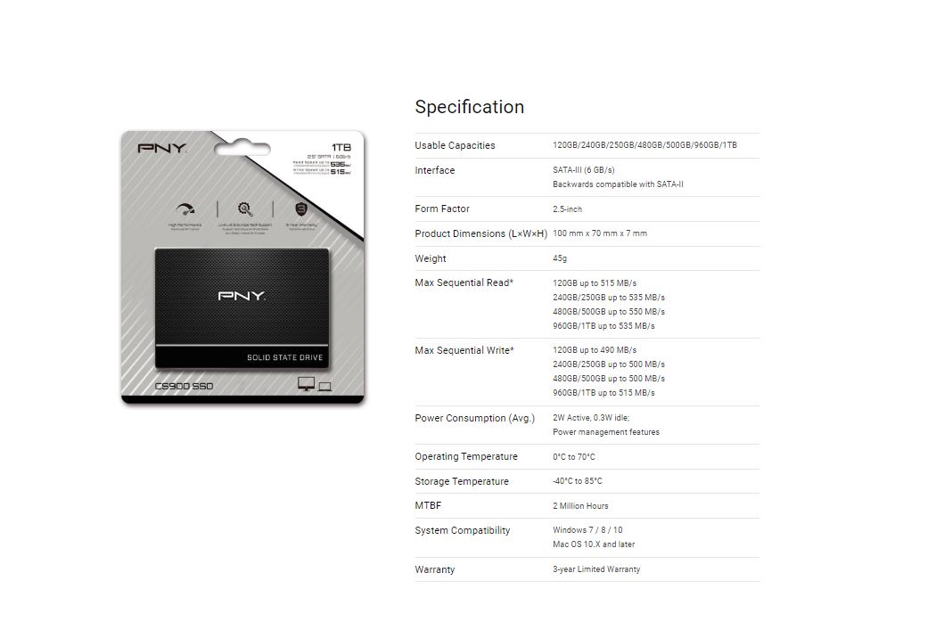 PNY CS900 is the ideal solution for a mainstream solid state drive (SSD) upgrade from a hard disk drive (HDD). The CS900 delivers all the most sought after features at an excellent value, and is designed for an easy and cost-effective HDD replacement in the PC system to help realize faster boot times, quicker application launches and better overall system performance. With no moving parts, PNY CS900 is highly durable, less likely to fail, and features a 3-Year Limited Warranty or TBW*.